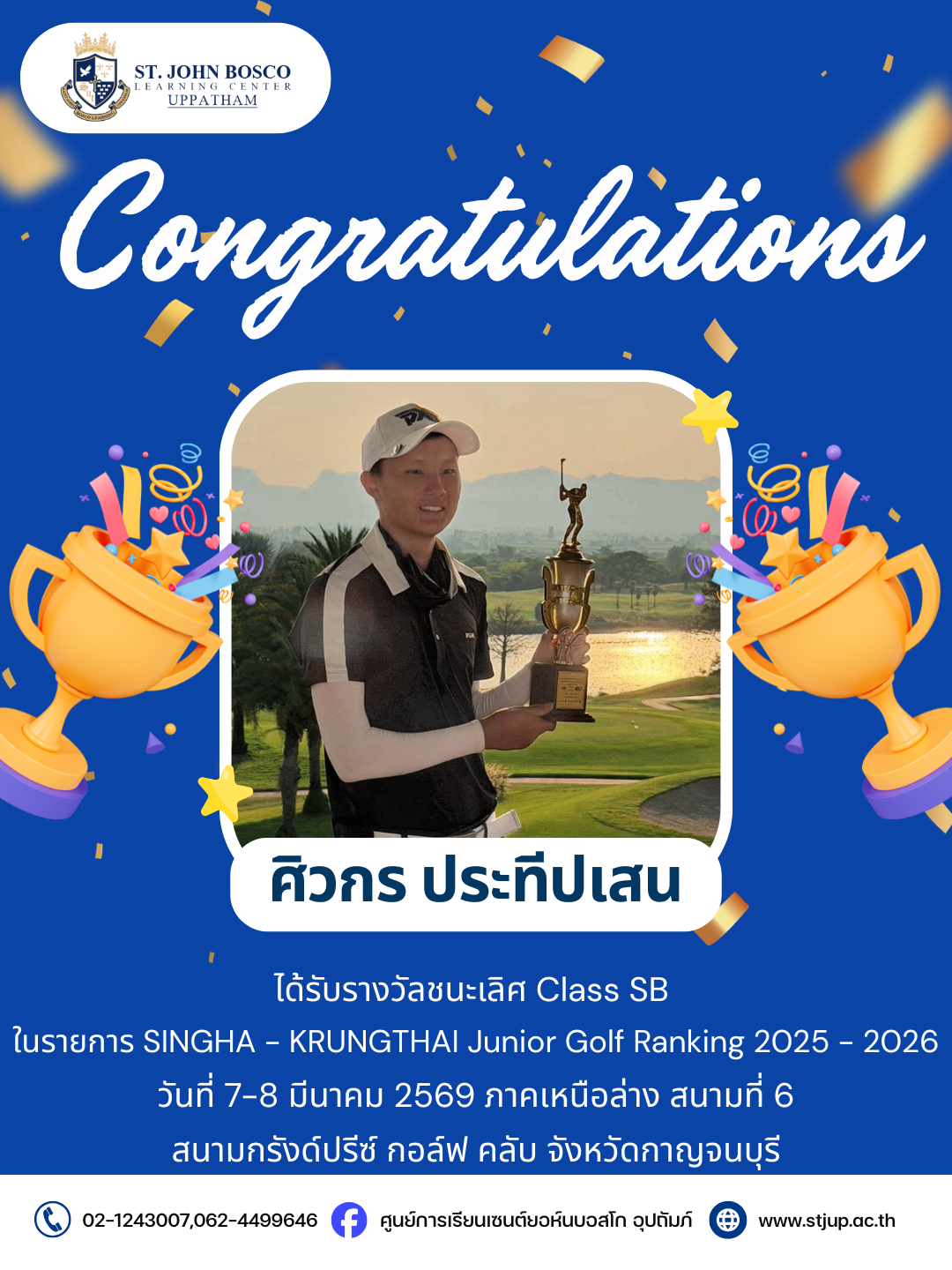 ศูนย์การเรียนเซนต์ยอห์นบอสโก อุปถัมภ์ ศิวกร ประทีปเสน ผู้เรียนระดับชั้นมัธยมศึกษาปีที่ 6 ได้รับรางวัลชนะเลิศ Class SB ในรายการ SINGHA – KRUNGTHAI Junior Golf Ranking 2025 – 2026 วันที่ 7-8 มีนาคม 2569 ภาคเหนือล่าง สนามที่ 6 สนามกรังด์ปรีซ์ กอล์ฟ คลับ จังหวัดกาญจนบุรี