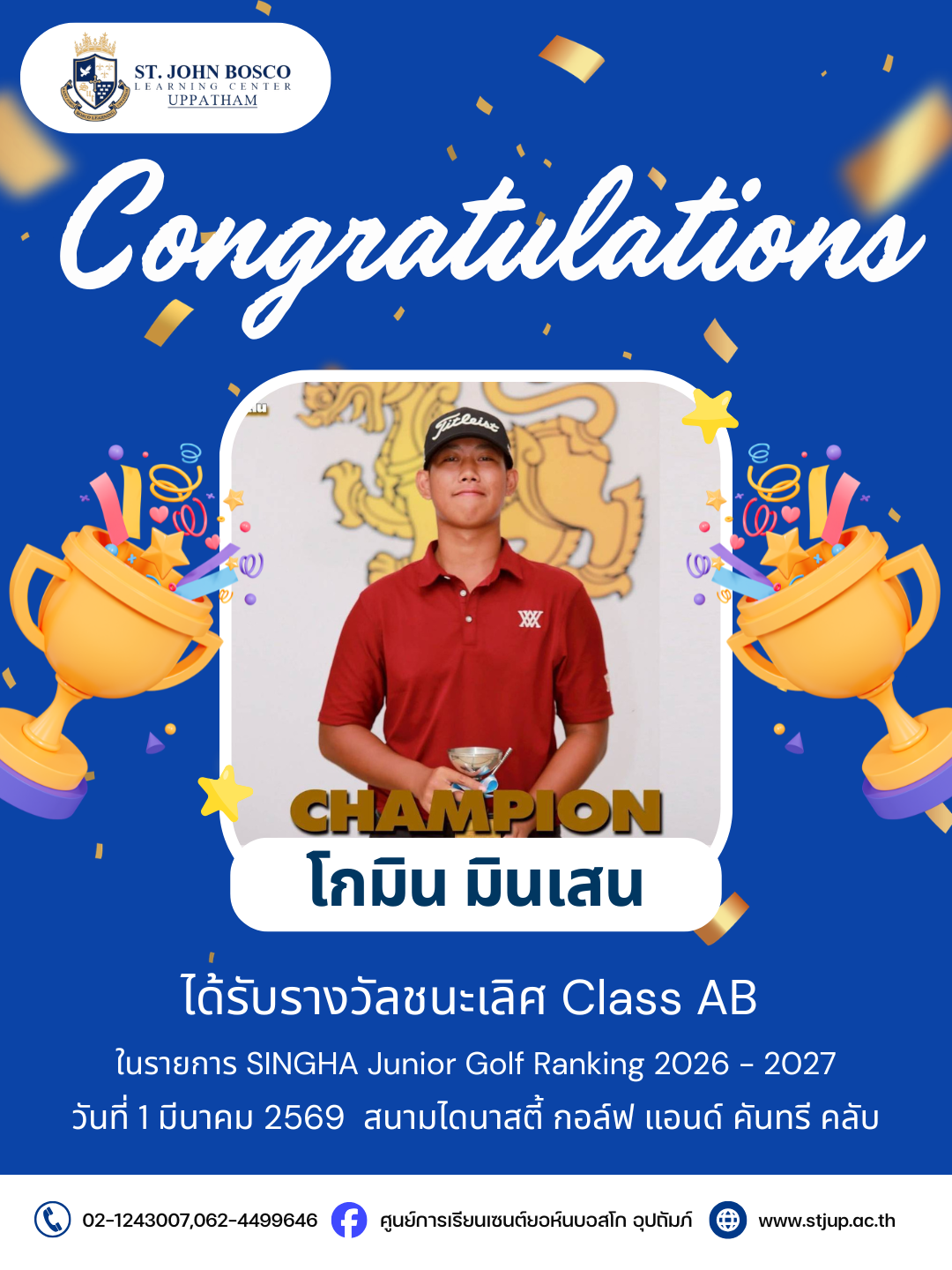ศูนย์การเรียนเซนต์ยอห์นบอสโก อุปถัมภ์ โกมิน มินเสน ผู้เรียนระดับชั้นมัธยมศึกษาปีที่ 5 ได้รับรางวัลชนะเลิศ Class AB ในรายการ SINGHA Junior Golf Ranking 2026 – 2027 ในวันที่ 1 มีนาคม 2569 สนามไดนาสตี้ กอล์ฟ แอนด์ คันทรี คลับ